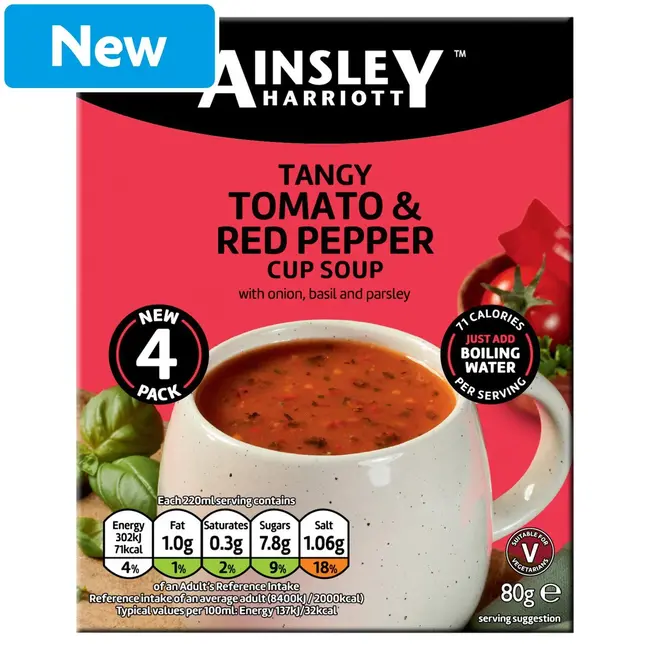 Sopa de Pimiento Rojo. Ingredientes: verduras (pimiento rojo (19%), tomate (16,5%), cebolla, zanahoria), almidón (patata, maíz), azúcar, sal, jarabe de glucosa deshidratado, maltodextrina, contiene aceite de colza y/o aceite de girasol, aceite de palma, hierbas (albahaca, perejil), nata en polvo (leche), colorantes: rojo de remolacha, carotenos, aromas, extracto de levadura, ácido: ácido cítrico, especias (cúrcuma, semillas de apio), proteína de leche, harina de trigo enriquecida (harina de trigo, carbonato de calcio, hierro, niacina, tiamina), estabilizador: fosfatos potásicos, regulador de acidez: citratos de sodio. alérgenos: leche, apio, trigo.