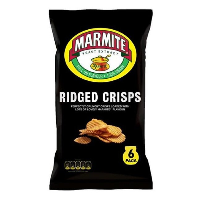 Patatas fritas sabor Marmite®. Ingredientes: patatas, aceites vegetales (colza, girasol) en proporciones variables, condimento sabor marmite® (extracto de levadura, harina de arroz, maltodextrina, sal, azúcar, ácido: ácido cítrico; cebolla en polvo, ajo en polvo, aroma, polvo de marmite® (extractos de levadura, sal, concentrado de zumo de verduras, vitaminas, aroma) (cebada, avena, centeno, trigo, apio), extracto de semilla de apio (apio)). alérgenos: cebada, trigo, apio.