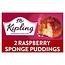 Pudin de bizcocho con frambuesa. Ingredientes: salsa de frambuesa (azúcar, agua, puré de frambuesa, jarabe de glucosa, almidón de maíz, ácido (ácido cítrico), regulador de acidez (citratos de sodio), conservador (sorbato potásico), aroma, estabilizante (goma xantana), colorante (carmín), aceite de colza), harina de trigo (con calcio, hierro, niacina, tiamina), aceites vegetales (palma, colza), agua, azúcar, humectante (glicerina vegetal), huevo deshidratado, suero de leche en polvo, gasificantes (difosfato disódico, bicarbonato de sodio), emulsionante (mono- y diglicéridos de ácidos grasos), aroma, colorante (curcumina). alérgenos: trigo, huevo, leche.
