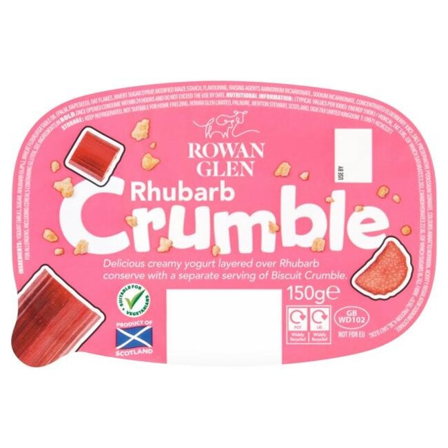 Ingredientes: yogur (LECHE), azúcar, ruibarbo (6,8%), harina de TRIGO, aceite vegetal (palma, colza), copos de AVENA, jarabe de azúcar invertido, almidón de maíz modificado, aroma, gasificantes (bicarbonato amónico, bicarbonato sódico), zumo de saúco concentrado, sal, conservante (sorbato potásico), colorantes (annatto, curcumina), regulador de la acidez (citrato sódico). alérgenos: LECHE TRIGO GLUTEN AVENA