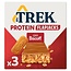 Barritas de proteína Trek. ingredientes: cobertura de galleta caramelizada (25%) [galletas caramelizadas (58%) (harina de trigo, azúcar, aceites vegetales (palma*, colza), jarabe de azúcar caramelizado, gasificante: carbonato ácido de sodio, harina de SOJA, sal, canela), aceite de palma*, azúcar, emulgente: lecitinas (SOJA)], avena (19%), jarabe de arroz, crujientes de proteína de SOJA (16%) (aislado de proteína de SOJA, almidón de tapioca, sal), aceites vegetales (colza, palma*), harina de SOJA, azúcar, sal, aroma natural, canela (casia). alérgenos: trigo, soja.